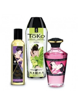 Kit composto por óleo de frutas exóticas, lubrificante Toko Melão e Manga e óleo afrodisíaco de framboesa.